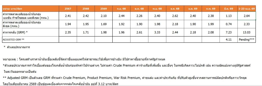 จากการรวบรวมและวิเคราะห์ข้อมูลต้นทุนในการกลั่นน้ำมันดิบจนเป็นน้ำมันเชื้อเพลิงของกลุ่มโรงกลั่นน้ำมันในช่วงวันที่ 1–16 เมษายน 2569 พบว่า เมื่อพิจารณาตามหลักการที่คำนึงถึงต้นทุนส่วนเพิ่มจากสถานการณ์ผิดปกติช่วงวิกฤตพลังงาน อาทิ Crude Premium, Product Premium, War Risk Premium, ค่าขนส่ง และค่าประกันภัย ยังปรากฏผลประโยชน์ส่วนเกินของกลุ่มโรงกลั่นน้ำมันอยู่ที่ 3.43 บาทต่อลิตร จึงเห็นควรนำผลประโยชน์ส่วนเกินดังกล่าวมาใช้เป็นส่วนลดราคาเพื่อให้ประชาชนได้รับประโยชน์อย่างเหมาะสม ภายใต้การคำนึงถึงความต่อเนื่องในการดำเนินธุรกิจของโรงกลั่นน้ำมันด้วย