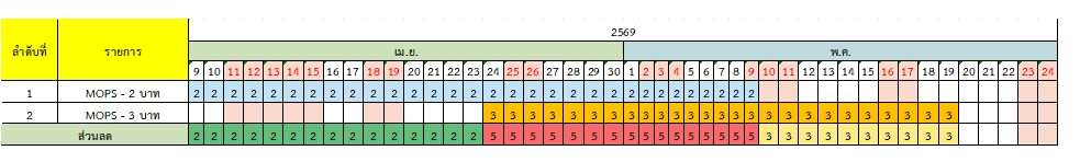 | 24 เม.ย. – 9 พ.ค. 69 | -2.00 บาท | -3.00 บาท (เพิ่ม) | 5.00 บาท/ลิตร |