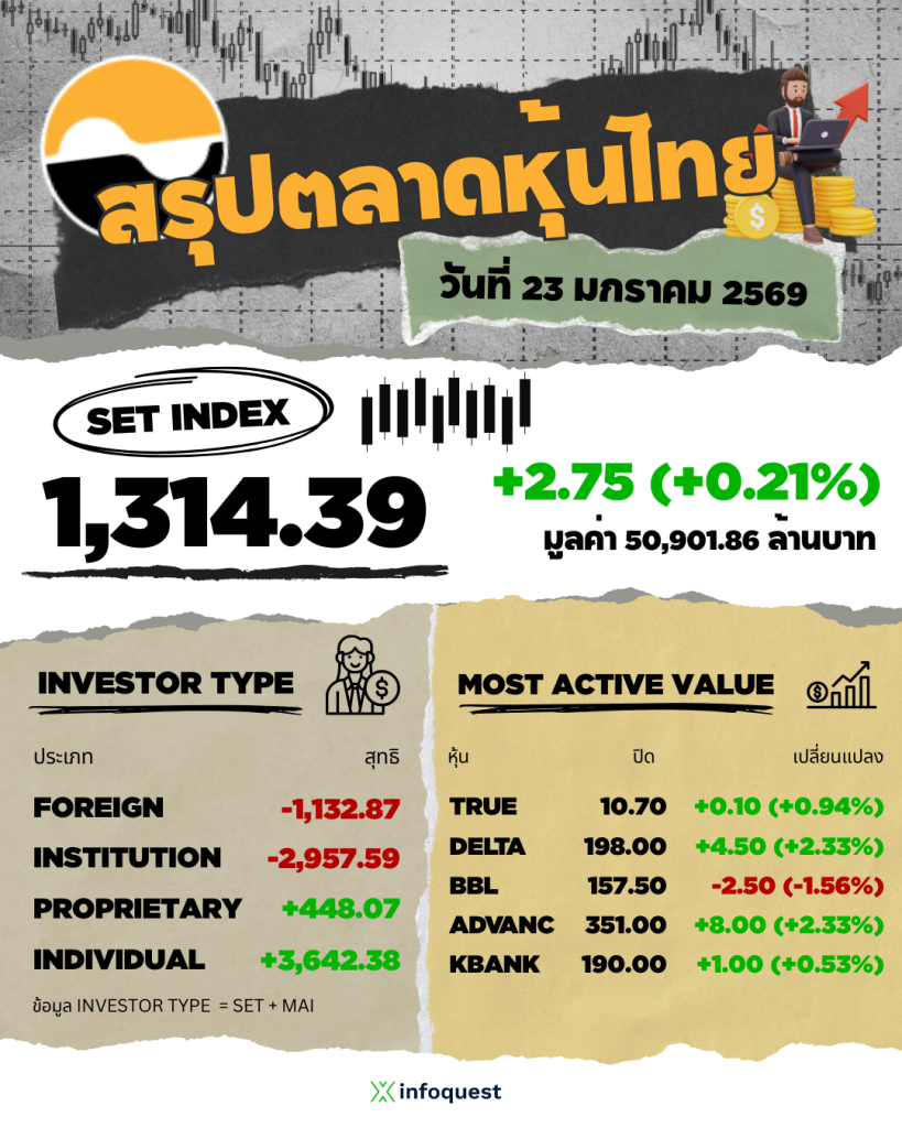 SET ปิดวันนี้ที่ 1,314.39 จุด เพิ่มขึ้น 2.75 จุด (+0.21%) มูลค่าซื้อขาย 50,901.86 ล้านบาท นักวิเคราะห์เผยตลาดหุ้นไทยท้ายภาคบ่ายลดช่วงบวกเผชิญแรงขายในวันสุดท้ายของสัปดาห์ วอลุ่มกระจุกตัวในหุ้น TRUE…