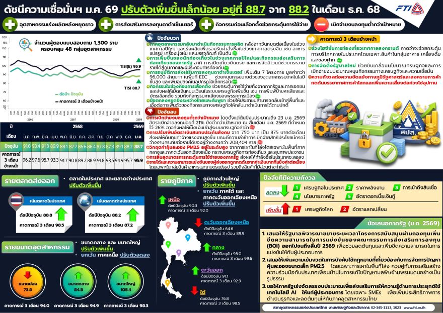 นายนาวา จันทนสุรคน รองประธานสภาอุตสาหกรรมแห่งประเทศไทย (ส.อ.ท.) เปิดเผยว่า ดัชนีความเชื่อมั่นภาคอุตสาหกรรม เดือนม.ค. 69 อยู่ที่ระดับ 88.7 ปรับตัวเพิ่มขึ้นจากระดับ 88.2 ในเดือนธ.ค. 68…