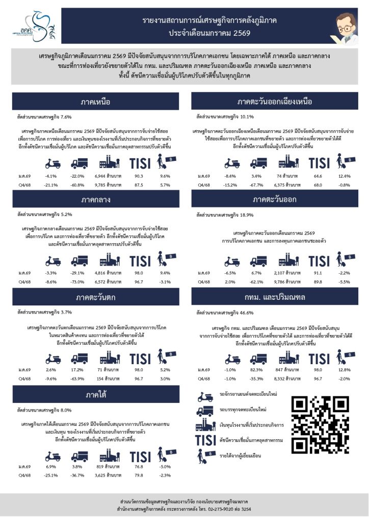 นายวินิจ วิเศษสุวรรณภูมิ ผู้อำนวยการสำนักงานเศรษฐกิจการคลัง (สศค.) เปิดเผยภาวะเศรษฐกิจภูมิภาค ประจำเดือนม.ค. 69 มีปัจจัยสนับสนุนจากการบริโภคภาคเอกชน โดยเฉพาะภาคใต้ ภาคเหนือ และภาคกลาง…