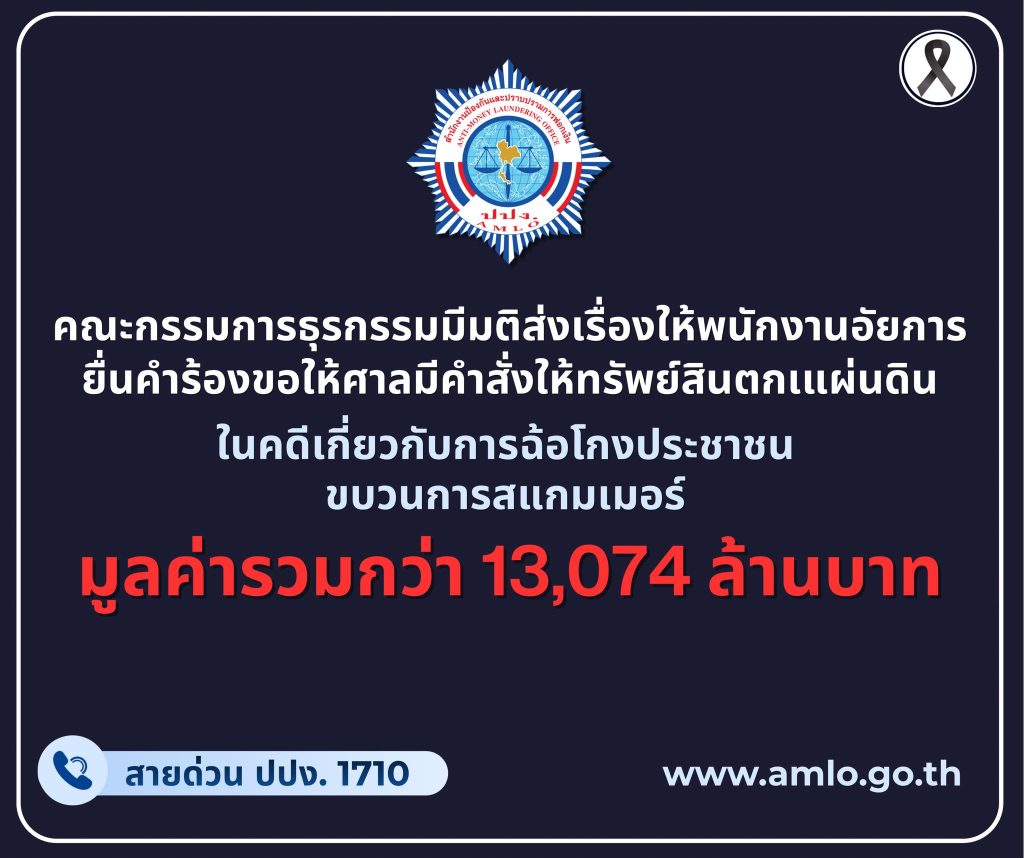 สำนักงานป้องกันและปราบปรามการฟอกเงิน (ปปง.) แถลงผลการประชุมคณะกรรมการธุรกรรม ซึ่งมีมติให้ส่งเรื่องไปยังพนักงานอัยการ เพื่อขอให้ศาลสั่งให้ทรัพย์สินจากขบวนการมิจฉาชีพและสแกมเมอร์ตกเป็นของแผ่นดิน…