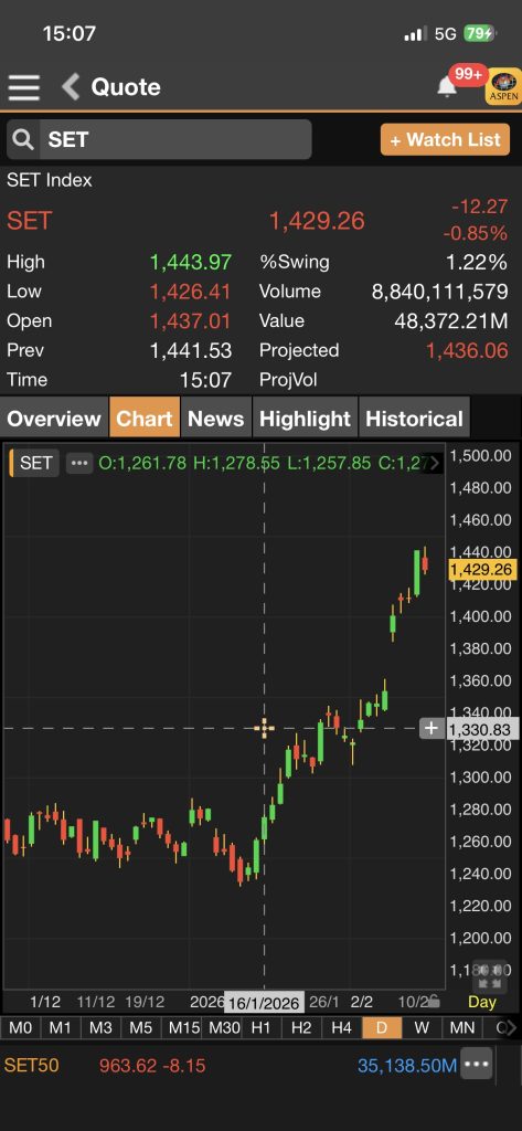 SET ปิดวันนี้ที่ 1,430.41 จุด ลดลง 11.12 จุด (-0.77%) มูลค่าซื้อขาย 66,146.84 ล้านบาท การซื้อขายหุ้นวันนี้ปรับลงตลอดวัน โดยทำจุดต่ำสุด 1,426.41 จุด และจุดสูงสุด 1,443.97 จุด ส่วนหลักทรัพย์เปลี่ยนแปลงว…