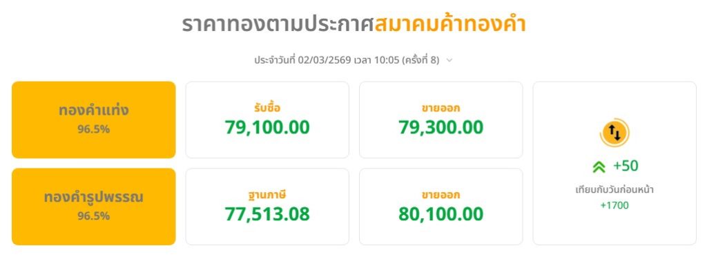 ราคาทองคำ (96.5%) ขายปลีกในประเทศเช้านี้ ราคาทองรูปพรรณ ขายออก ทะลุ 80,000 บาทแล้ว หลังเปิดเช้ามาพุ่งพรวดเดียว 1,150 บาท และยังทยอยปรับขึ้นต่อเนื่องจากสถานการณ์ตึงเครียดในภูมิภาคตะวันออกกลาง…