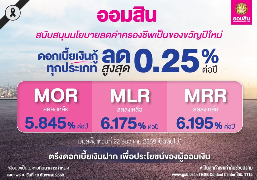 “ออมสิน” รับลูกกนง. ลดดอกเบี้ยเงินกู้ทุกประเภทสูงสุด 0.25% มีผล 22 ธ.ค. นี้