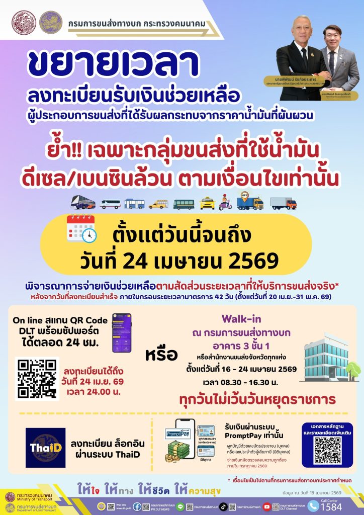 คมนาคมขยายเวลารับเงินช่วยเหลือกลุ่มขนส่งใช้ดีเซล/เบนซินล้วนถึง 24 เมย.69