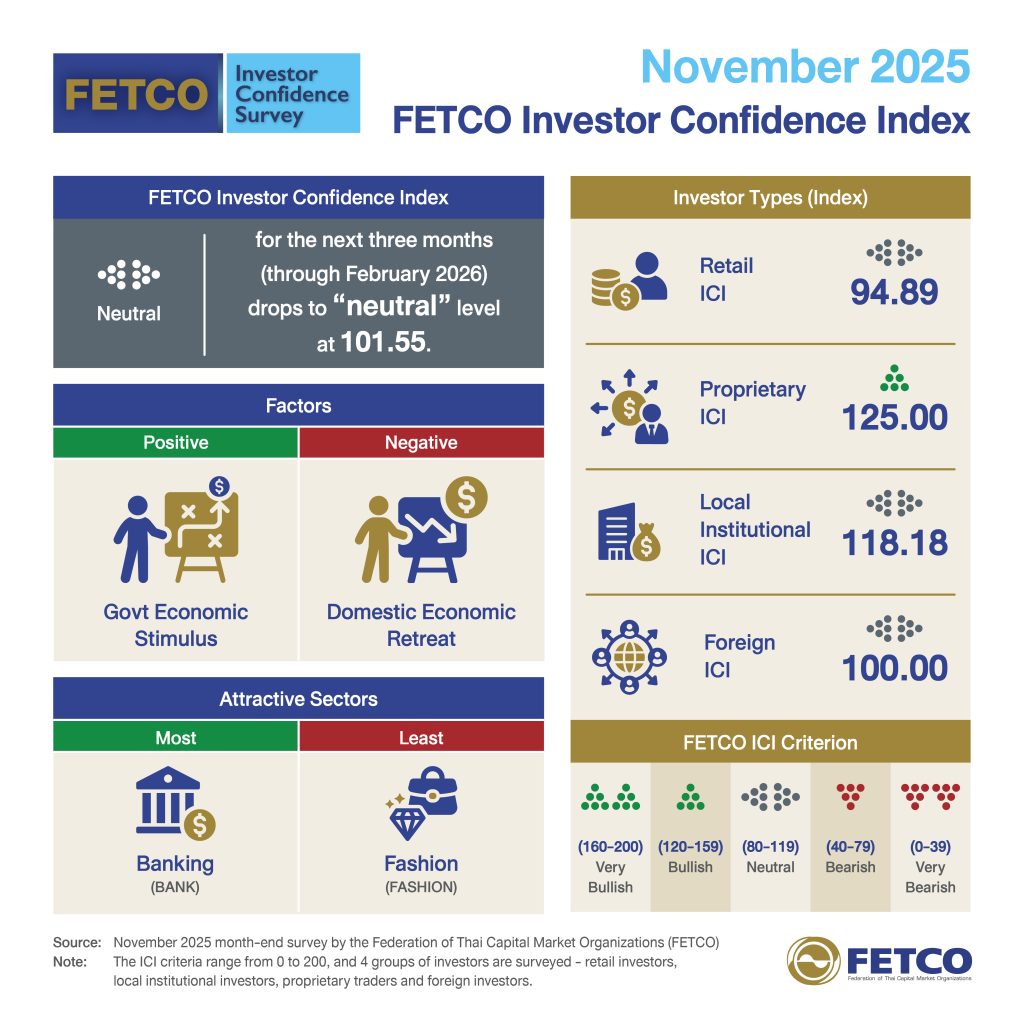 FETCO เปิดดัชนีเชื่อมั่นนักลงทุนย่อลงสู่เกณฑ์ “ทรงตัว” จับตามาตรการกระตุ้นเศรษฐกิจ-ดอกเบี้ยกนง.