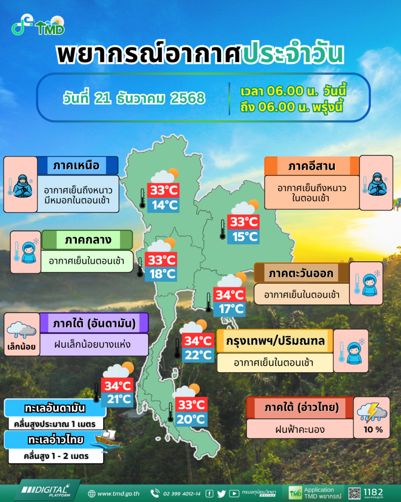 ภาคเหนือ-อีสานอากาศเย็นถึงหนาว ใต้มีฝนน้อยลง กทม.-ตะวันออกเช้าสัมผัสอากาศเย็น