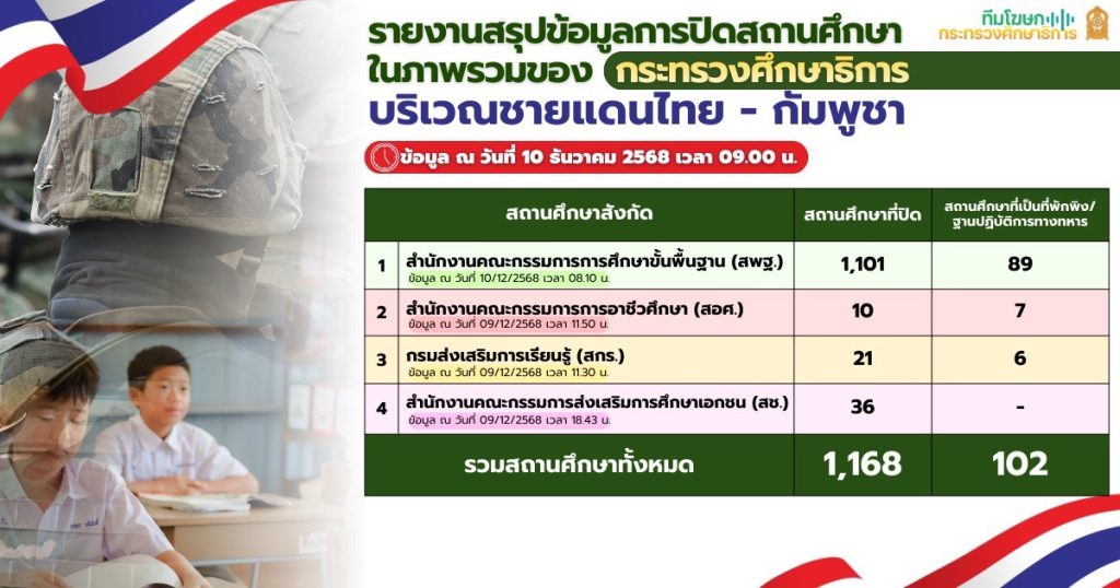 ไทย-กัมพูชา:สั่งปิดโรงเรียนพื้นที่ชายแดนเพิ่มเป็น 1,168 แห่ง เปิด 102 แห่งเป็นศูนย์พักพิง