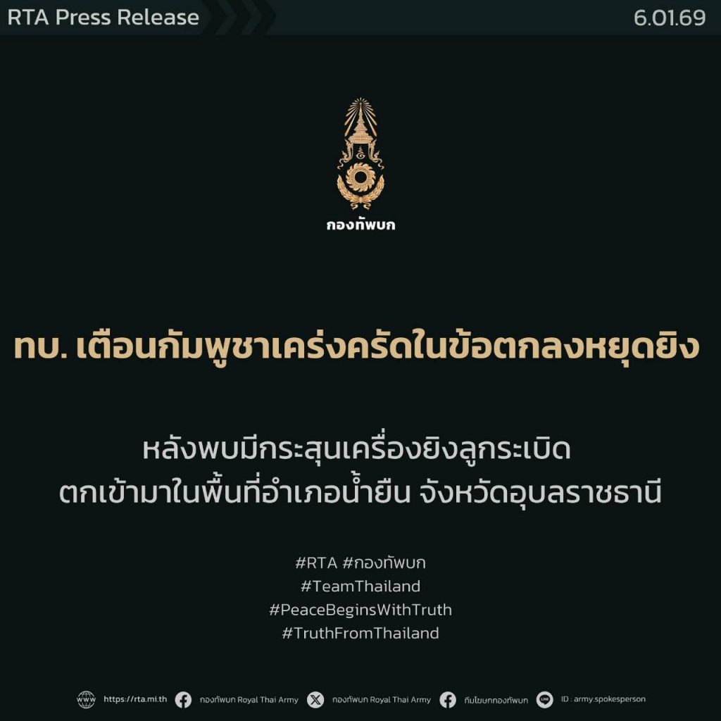 ไทย-กัมพูชา: โฆษก ทบ.ฮึ่มเตือนกัมพูชาเคร่งครัดมาตรการหยุดยิง ขู่พร้อมตอบโต้หากเกิดเหตุซ้ำ