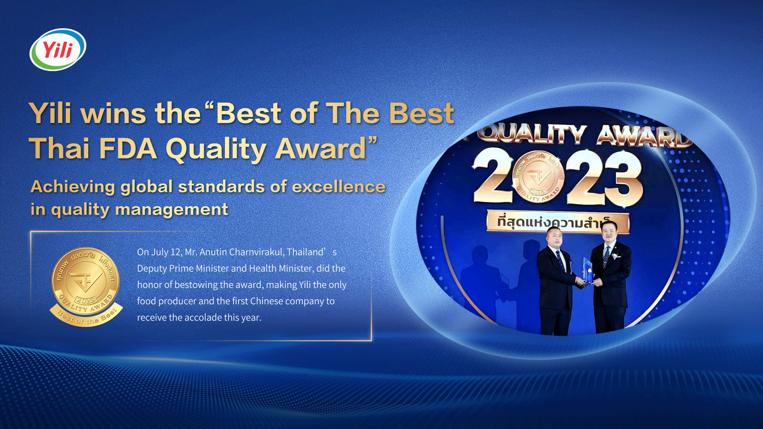 นายอนุทิน ชาญวีรกูล รองนายกรัฐมนตรีและรัฐมนตรีว่าการกระทรวงสาธารณสุข ได้เป็นผู้มอบรางวัลอย. ควอลิตี้ อวอร์ด ประเภท Best of the Best ให้แก่ Yili และกล่าวว่า ผลิตภัณฑ์นมของ Yili มีคุณภาพสูงและรสชาติดี คู่ควรสำหรับรางวัลในครั้งนี้แล้ว