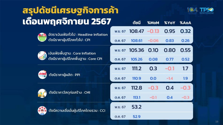 สำนักงานนโยบายและยุทธศาสตร์การค้า (สนค.) กระทรวงพาณิชย์ เปิดเผยว่า ดัชนีราคาผู้บริโภคทั่วไป (CPI) เดือน พ.ย.67 อยู่ที่ 108.47 หรืออัตราเงินเฟ้อทั่วไป สูงขึ้น 0.95% จากเดือนเดียวกันของปีก่อน จากตลาดคาด 0.9 - 1.2% โดยมีปัจจัยหลักจากการสูงขึ้นของราคาน้ำมันดีเซล ที่เป็นผลจากฐานราคาต่ำในปีก่อน รวมถึงราคาสินค้าในหมวดอาหารและเครื่องดื่มปรับตัวสูงขึ้น จากราคาผลไม้สด เครื่องประกอบอาหาร และเครื่องดื่มไม่มีแอลกอฮอล์ ส่งผลให้อัตราเงินเฟ้อเฉลี่ย 11 เดือนแรกของปีนี้ (ม.ค.-พ.ย.67) เพิ่มขึ้น 0.32%