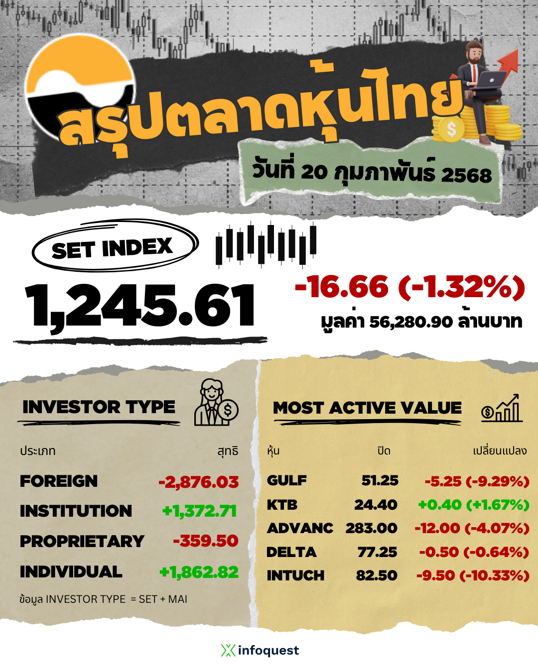 SET ปิดวันนี้ที่ 1,245.61 จุด ลดลง 16.66 จุด (-1.32%) มูลค่าซื้อขาย 56,280.90 ล้านบาท