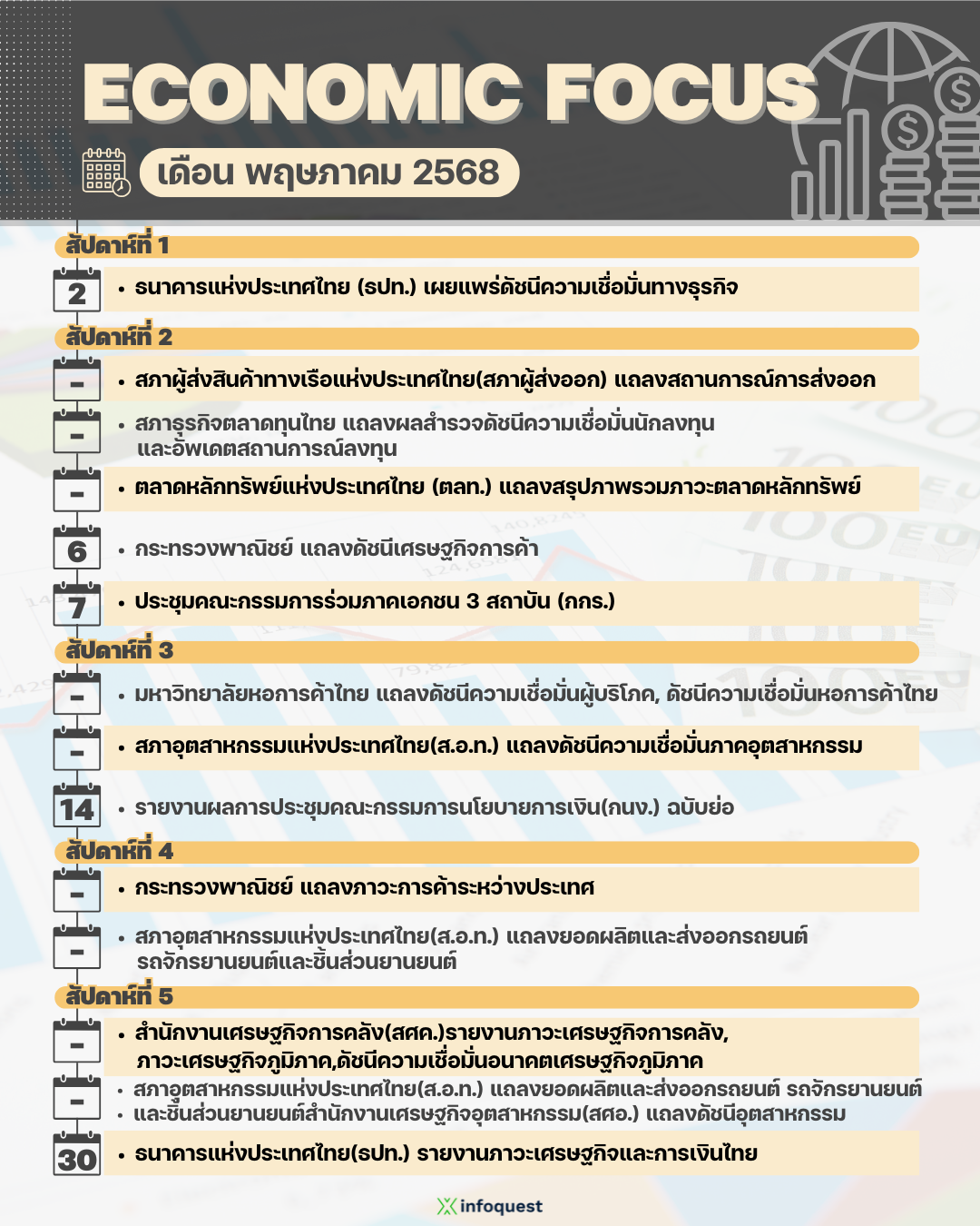 2 พ.ค.        ธนาคารแห่งประเทศไทย (ธปท.) เผยแพร่ดัชนีความเชื่อมั่นทางธุรกิจ