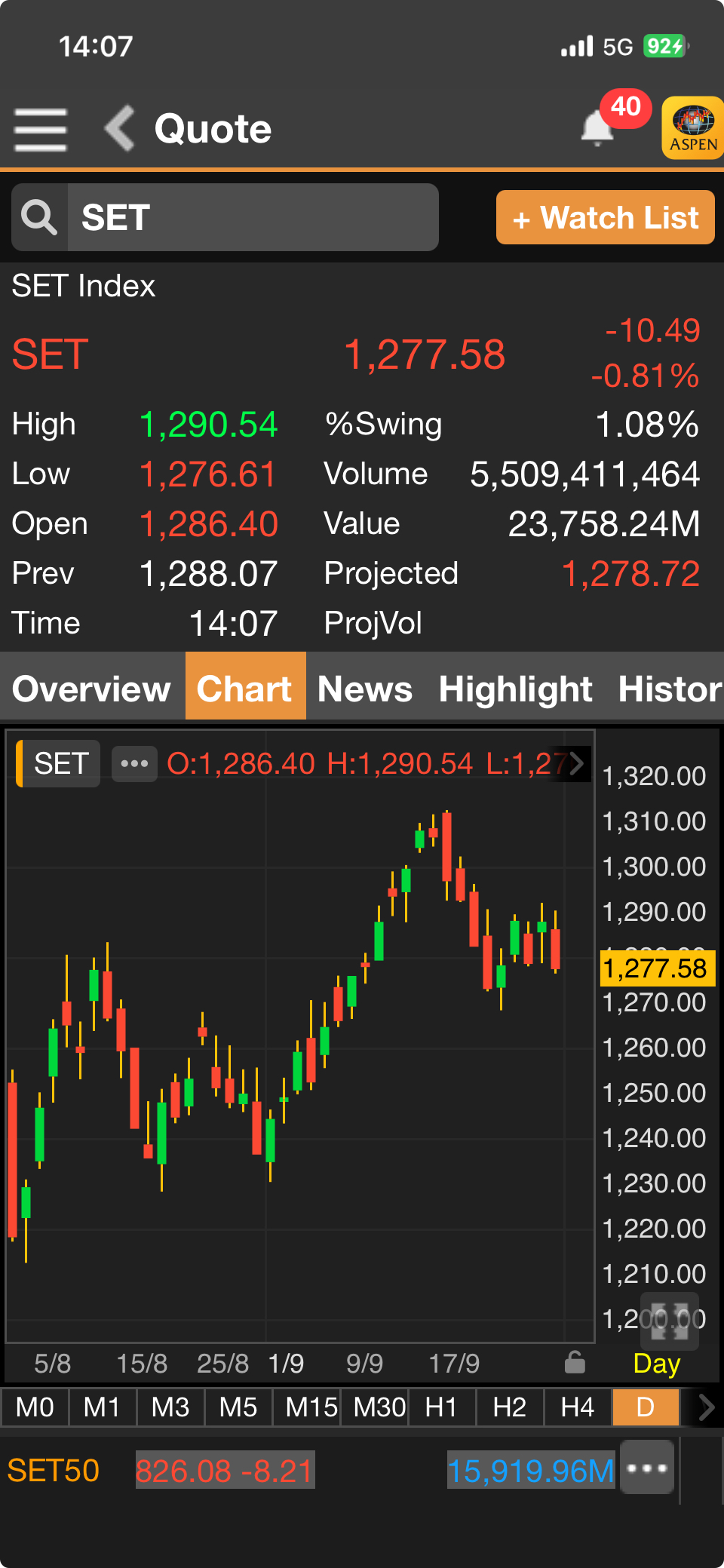 เมื่อเวลา 14.07 น. ดัชนี SET อยู่ที่ 1,277.58 จุด ลดลง 10.49 จุด (-0.81%)