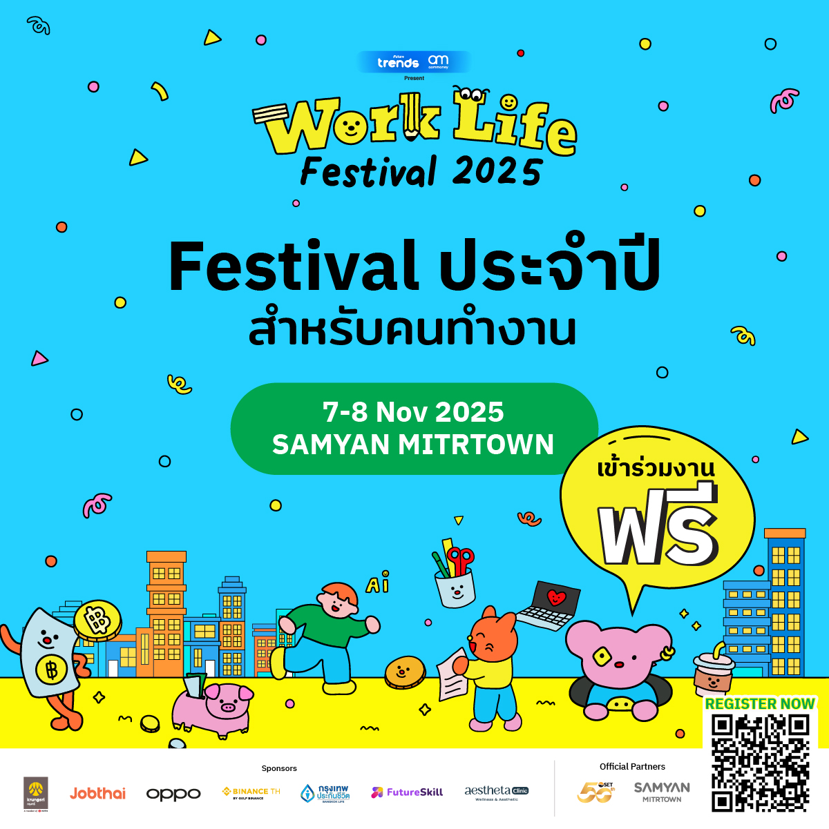 Future Trends และ aomMONEY ผนึกกำลังร่วมกับ ธนาคารกรุงศรีอยุธยา จำกัด (มหาชน), JobThai, OPPO Thailand, ไบแนนซ์ ทีเอช บาย กัลฟ์ ไบแนนซ์ (BINANCE TH), กรุงเทพประกันชีวิต จำกัด (มหาชน), FutureSkill, Aestheta Clinic Wellness and Aesthetic, ตลาดหลักทรัพย์แห่งประเทศไทย, สามย่านมิตรทาวน์, MedPark Hospital, ZipEvent, BeWell และศาลานา จัดงาน 'WORK LIFE FESTIVAL 2025' เฟสติวัลเพื่อคนทำงานสุดยิ่งใหญ่แห่งปี รวมทุกมิติของชีวิตการทำงานไว้ครบในที่เดียว ครอบคลุมทั้ง Work, Wealth, Well-being และ We-creation ระหว่างวันที่ 7 - 8 พฤศจิกายน 2568 ณ สามย่านมิตรทาวน์ฮอลล์