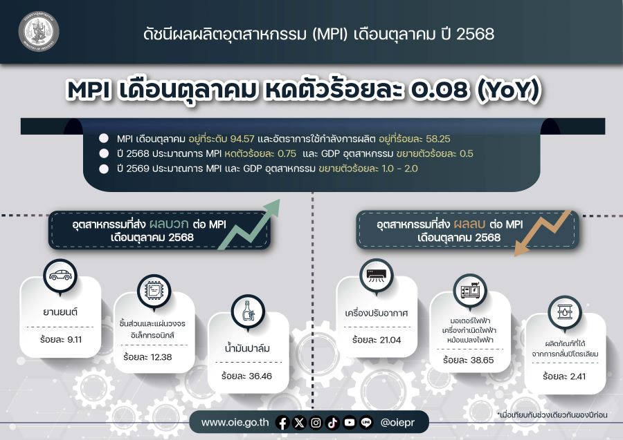 สำนักงานเศรษฐกิจอุตสาหกรรม (สศอ.) แถลงดัชนีผลผลิตอุตสาหกรรม (MPI) เดือน ต.ค.68 อยู่ที่ระดับ 94.57 พลิกกลับมาหดตัวอีกครั้ง 0.08% จากช่วงเดียวกันของปีก่อน และหดตัว 0.16% จากเดือน ก.ย.68 ขณะที่อัตราการใช้กำลังการผลิต (CapU) ในเดือน ต.ค.68 อยู่ที่ 58.25 ลดลงจาก 58.45 ในเดือน ก.ย.68 เนื่องจากนโยบายการค้าของสหรัฐกระทบต่อภาคอุตสาหกรรมและเกษตรแปรรูปของไทย ความเชื่อมั่นภาคอุตสาหกรรมปรับตัวลดลง โดยมีปัจจัยหลักจากการนำเข้าสินค้าต่างประเทศเพิ่มขึ้นต่อเนื่อง ความกังวลต่อสถานการณ์น้ำและอุทกภัยในหลายพื้นที่ และมูลค่าการค้าชายแดนหดตัวต่อเนื่องและ การท่องเที่ยวจากต่างประเทศลดลงต่อเนื่อง