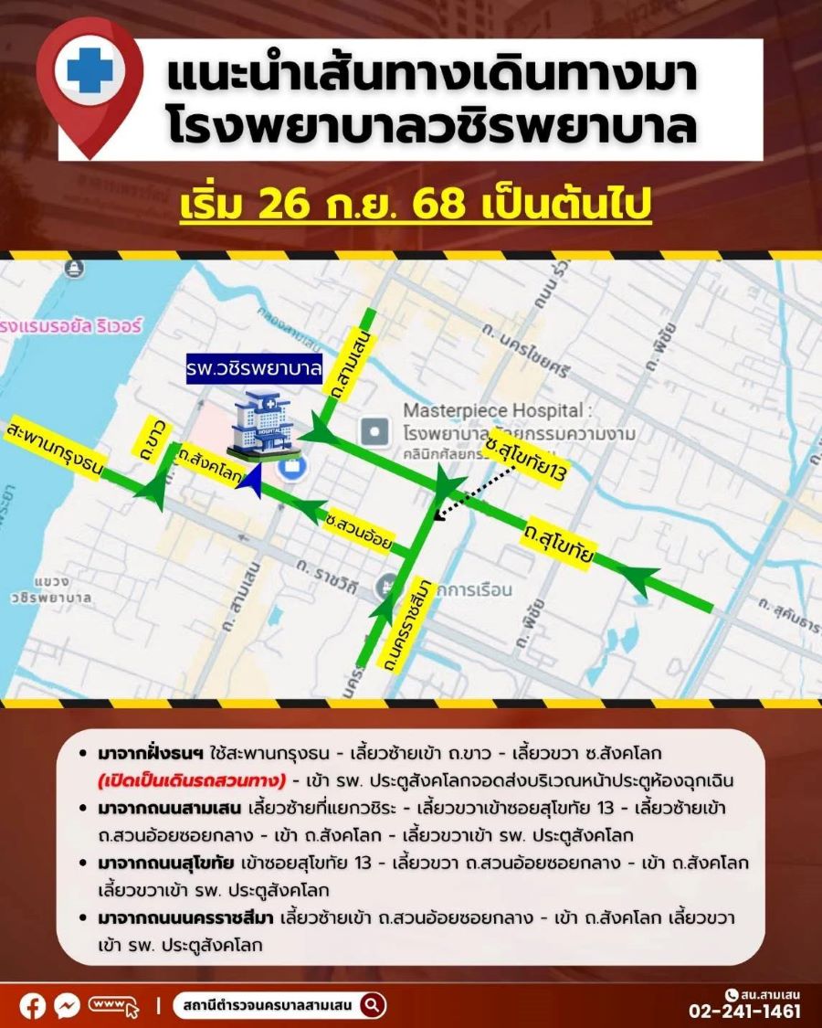 สำหรับการเดินทางมายัง รพ.วชิรพยาบาล สน.สามเสน ขอแนะนำเส้นทางเข้า-ออก ดังนี้