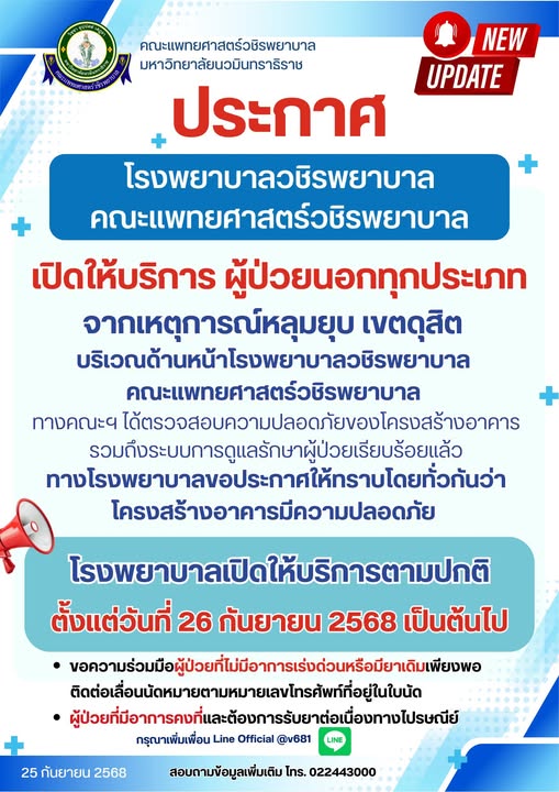 จากเหตุการณ์หลุมยุบหน้าโรงพยาบาลวชิรพยาบาล ทางคณะแพทยศาสตร์วชิรพยาบาล ได้ดำเนินการตรวจสอบความปลอดภัยของโครงสร้างอาคาร รวมถึงระบบการดูแลรักษาผู้ป่วยเรียบร้อยแล้ว โดยทาง รพ.วชิรฯ จะกลับมาเปิดให้บริการผู้ป่วยนอกทุกประเภทรวมถึง คลินิกปฐมภูมิเขตเมืองวชิรพยาบาลตามปกติ ตั้งแต่วันที่ 26 ก.ย.นี้เป็นต้นไป