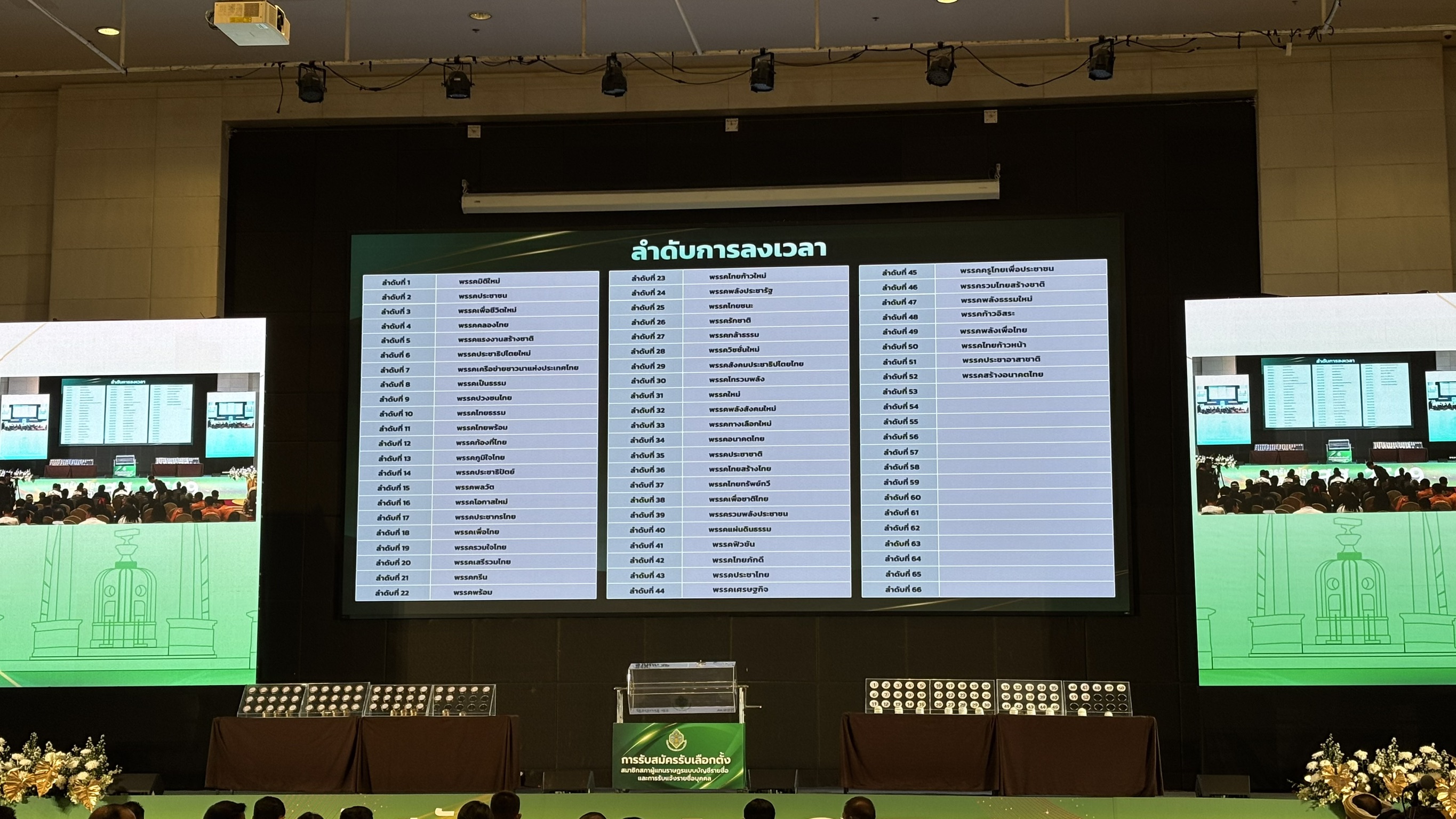 นายณรงค์ กลั่นวารินทร์ ประธานกกต.แถลงว่า จำนวนพรรคการเมืองที่มาลงทะเบียนในใบลงทะเบียนก่อนเวลา 8:30 น มีจำนวนทั้งสิ้น 52 พรรคโดยทุกพรรคจะต้องเข้าสู่กระบวนการตรวจสอบเอกสารให้ถูกต้องครบถ้วนก่อนจึงจะมีสิทธิ์เข้าจับสลากได้ เพื่อให้การรับสมัครเป็นไปด้วยความเรียบร้อย