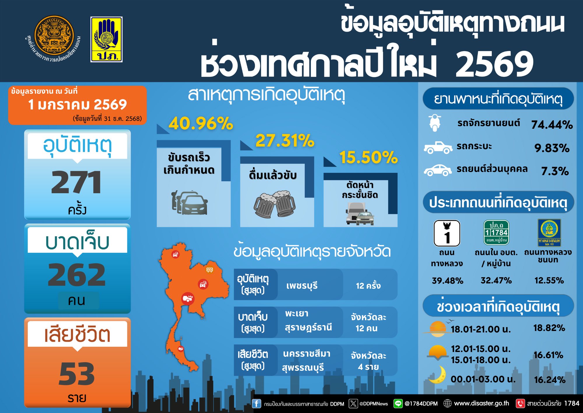 ศูนย์อำนวยการความปลอดภัยทางถนน (ศปถ.) แถลงสรุปสถิติอุบัติเหตุทางถนนช่วงเทศกาลปีใหม่ 2569 ประจำวันที่ 31 ธันวาคม 2568 ซึ่งเป็นวันที่สองของการรณรงค์ "ขับขี่ปลอดภัย ลดความเร็ว ลดอุบัติเหตุ" เกิดอุบัติเหตุ 271 ครั้ง ผู้บาดเจ็บ 262 คน ผู้เสียชีวิต 53 ราย