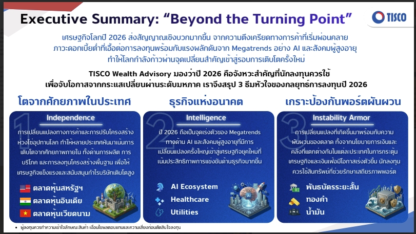 TISCO Wealth Advisory มองว่าปี 69 เป็นจังหวะสำคัญที่นักลงทุนควรใช้เพื่อจับโอกาสจากกระแสเปลี่ยนผ่านระดับมหภาค โดยใช้ 3 ธีมหัวใจของกลยุทธ์การลงทุนปี 2569 ได้แก่ 1.Independence : ประเทศที่โตได้ด้วยศักยภาพภายใน 2.Intelligence : พลังการเติบโตใหม่จาก AI Ecosystem และ 3.Instability Armor : เกราะป้องกันพอร์ตในยุคความผันผวนสูง ซึ่งทั้งสามธีมทำงานสอดประสานกันอย่างเป็นระบบ และสะท้อนทิศทางการลงทุนในรอบใหม่ของเศรษฐกิจโลก