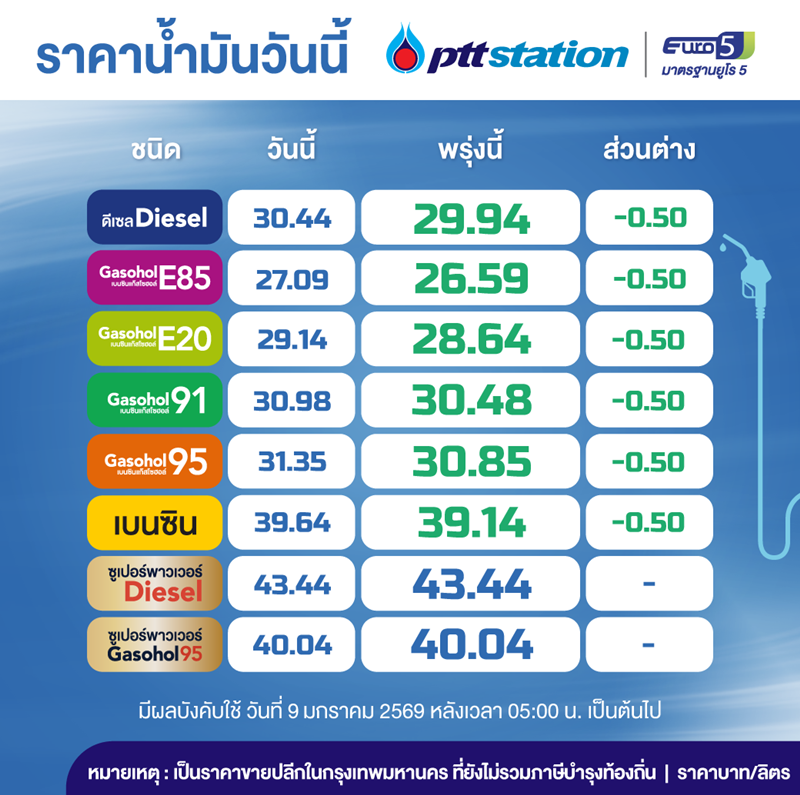 บมจ.ปตท.น้ำมันและการค้าปลีก (OR) และ บมจ.บางจาก คอร์ปอเรชั่น (BCP) ปรับลดราคาขายปลีกน้ำมันกลุ่มเบนซิน แก๊สโซฮอล์ และกลุ่มดีเซล ลงลิตรละ 50 สตางค์ โดยมีผลตั้งแต่วันที่ 9 ม.ค.69