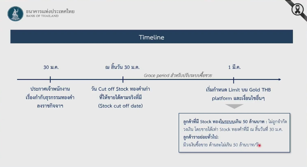 1. กำหนดวงเงินการซื้อหรือขายทองคำไม่เกินด้านละ 50ล้านบาท/คน/แพลตฟอร์ม บนแพลตฟอร์มที่ชำระเป็นสกุลบาทเท่านั้น (ไม่ครอบคลุมการซื้อขายทองคำที่ชำระเป็นสกุลเงินดอลลาร์สหรัฐฯ การซื้อขายผ่านร้านทองทั่วไป การซื้อบนแพลตฟอร์มที่มีลักษณะออมทอง [ที่ไม่สามารถขายได้] หรือการซื้อขายในศูนย์ซื้อขายสัญญาล่วงหน้า (TFEX))