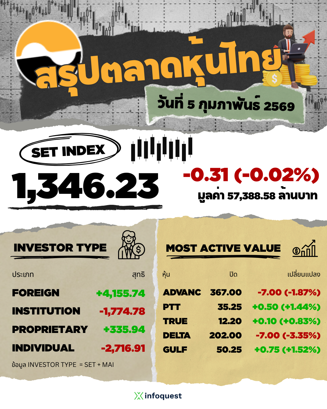 ภาวะตลาดหุ้นไทย: ปิดลบ 0.31 จุด เจอ DELTA-ADVANC ถ่วง สลับ PTT-GULF ช่วยพยุง จับตาโค้งสุดท้ายก่อนเลือกตั้ง