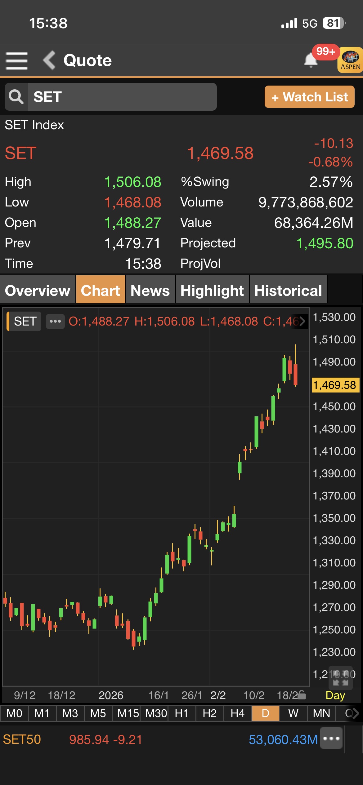 เมื่อเวลา 15.38 น.ดัชนี SET มาอยู่ที่ 1,469.58 จุด ลดลง 10.13 จุด (-0.68%)