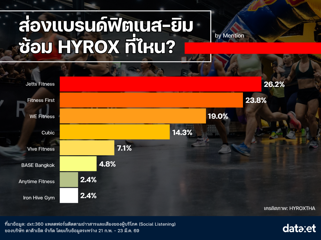 บริษัท ดาต้าเซ็ต จำกัด ได้รวบรวมข้อมูลบทสนทนาบนโซเชียลมีเดียผ่านเครื่องมือ dxt:360 Social Listening ในช่วงวันที่ 21 กุมภาพันธ์ - 23 มีนาคม 2569 เพื่อวิเคราะห์ภาพรวมการพูดถึงประเด็น HYROX บนโลกออนไลน์ โดยพบว่า HYROX ไม่ได้เป็นเพียงงานแข่งกีฬาเฉพาะกลุ่มอีกต่อไป แต่ได้สร้าง "แรงกระเพื่อม" ไปสู่วงการบันเทิง อุปกรณ์กีฬา และธุรกิจฟิตเนสอย่างชัดเจน