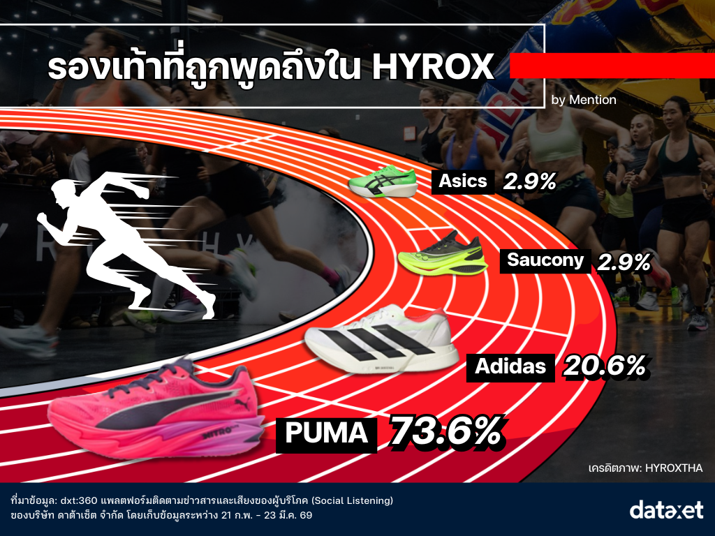 - PUMA (73.6%): PUMA ถูกพูดถึงมากที่สุด โดยส่วนหนึ่งมาจากบทบาทในฐานะ Global Partner ของงาน ทำให้ครองพื้นที่สื่อไปถึง 73.6% โดยรุ่น PUMA x HYROX Deviate NITRO(TM) Elite 4 ก็ได้รับการพูดถึงและรีวิวอย่างต่อเนื่องในฐานะรองเท้าที่ผลิตมาสำหรับการแข่งขันประเภทนี้โดยเฉพาะ