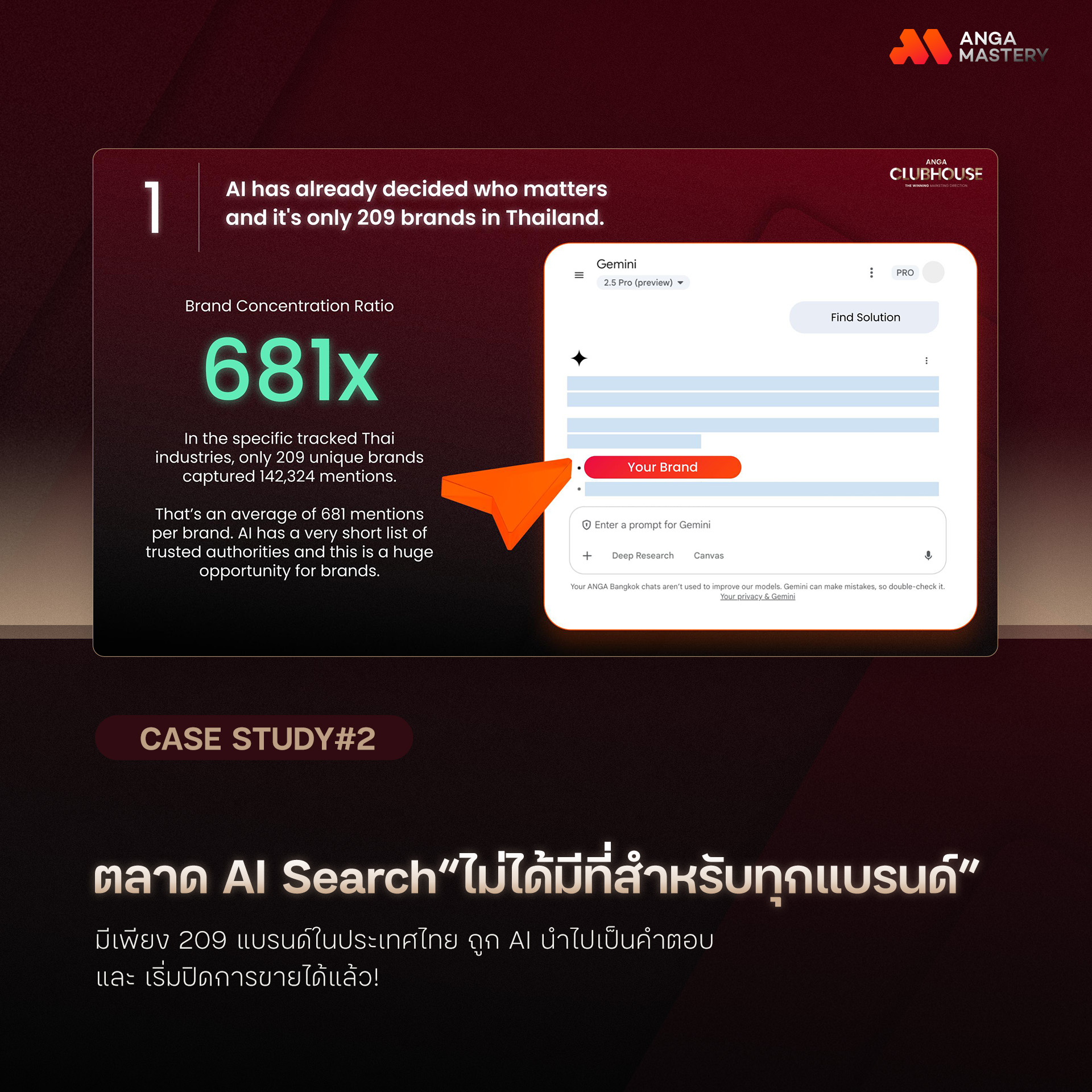 -จากการศึกษาของ ANGA Bangkok Agency กว่า 215,339 URL ในประเทศไทย สะท้อนว่า มีเพียง 209 แบรนด์เท่านั้น ที่ถูกแนะนำซ้ำอย่างต่อเนื่อง ในขณะที่ประเทศไทยมีแบรนด์อยู่หลายหมื่นแบรนด์ ตัวเลขนี้สะท้อนชัดว่า ใครเข้ามาได้ก่อน มีโอกาสยึดพื้นที่ได้ก่อน นี่คือเกมของ แบรนด์ที่ขยับตัวก่อนเป็น First Mover อย่างแท้จริง