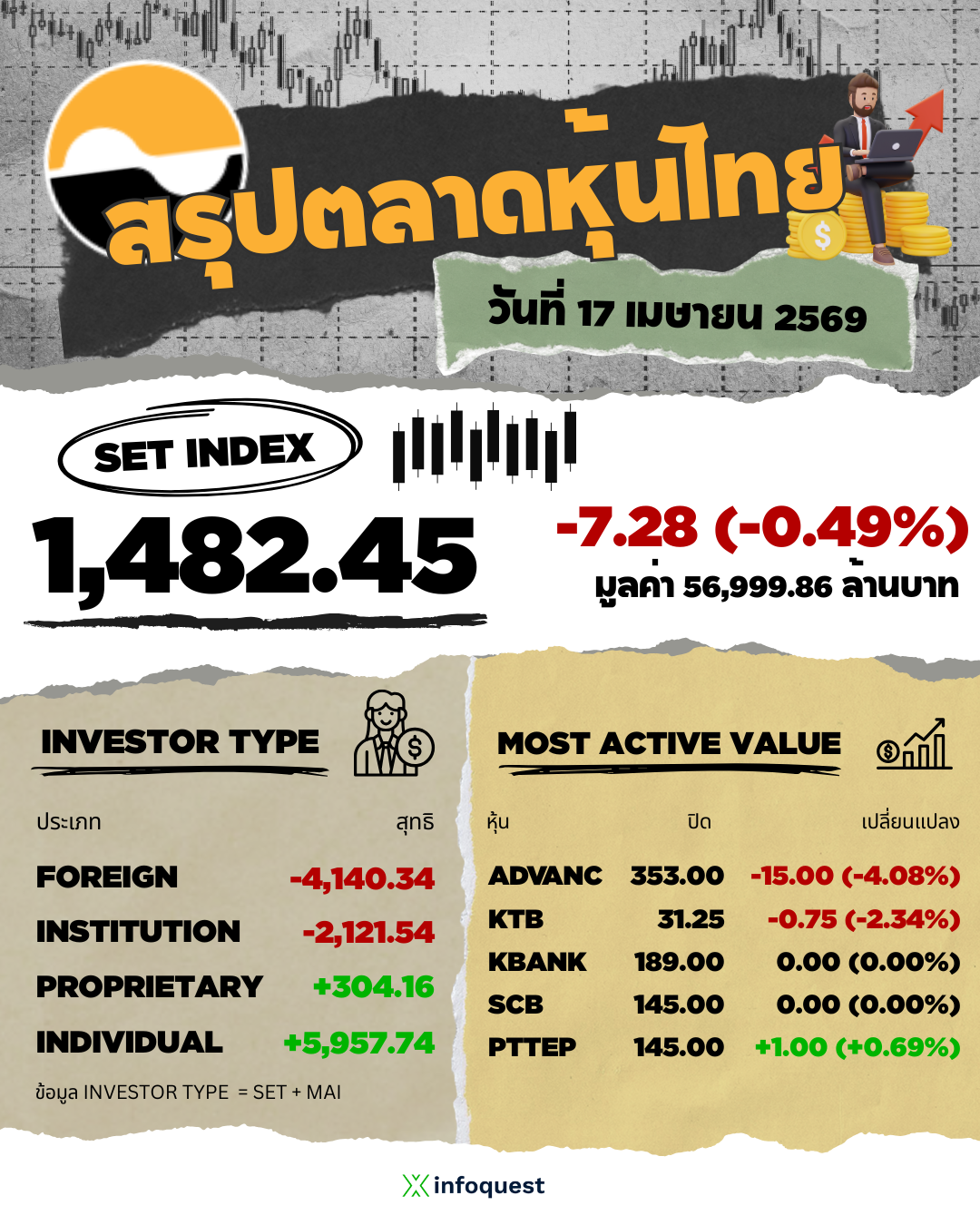 ตลาดหุ้นไทยปิดวันนี้ที่ระดับ 1,482.45 จุด ลดลง 7.28 จุด (-0.49%) มูลค่าซื้อขาย 56,999.86 ล้านบาท