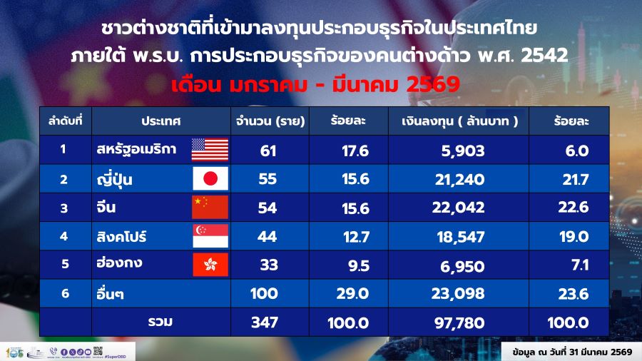 ทั้งนี้ เฉพาะเดือนมีนาคม 2569 มีการอนุญาตให้คนต่างชาติประกอบธุรกิจในประเทศไทย 104 ราย เป็นการลงทุนผ่านช่องทางการขอรับใบอนุญาตประกอบธุรกิจของคนต่างด้าว 31 ราย และการขอหนังสือรับรองการประกอบธุรกิจของคนต่างด้าว (ผ่านช่องทางการลงทุนตามกฎหมายว่าด้วยการส่งเสริมการลงทุน หรือได้รับอนุญาตตามกฎหมายว่าด้วยการนิคมอุตสาหกรรมแห่งประเทศไทย และการใช้สิทธิตามสนธิสัญญาหรือความตกลงระหว่างประเทศ) 73 ราย เงินลงทุนรวมทั้งสิ้น 33,351 ล้านบาท ส่วนใหญ่เป็นคนต่างชาติจาก สิงคโปร์ ญี่ปุ่น และสหรัฐอเมริกา ตามลำดับ มีการจ้างงานคนไทยจากนักลงทุนที่ขอรับใบอนุญาตประกอบธุรกิจของคนต่างด้าว 494 คน รวมถึงมีการถ่ายทอดเทคโนโลยีอันเป็นองค์ความรู้เฉพาะด้านโดยตรงจากประเทศผู้เข้ามาลงทุนให้แก่คนไทย เช่น องค์ความรู้เกี่ยวกับการตรวจสอบด้านสิ่งแวดล้อมและการควบคุมสถานีจ่ายน้ำมันและก๊าซ องค์ความรู้เกี่ยวกับการวิเคราะห์ของเสีย และนวัตกรรมการเพิ่มอัตราการรีไซเคิล และองค์ความรู้เกี่ยวกับระบบบริหารจัดคลังสินค้า เป็นต้น