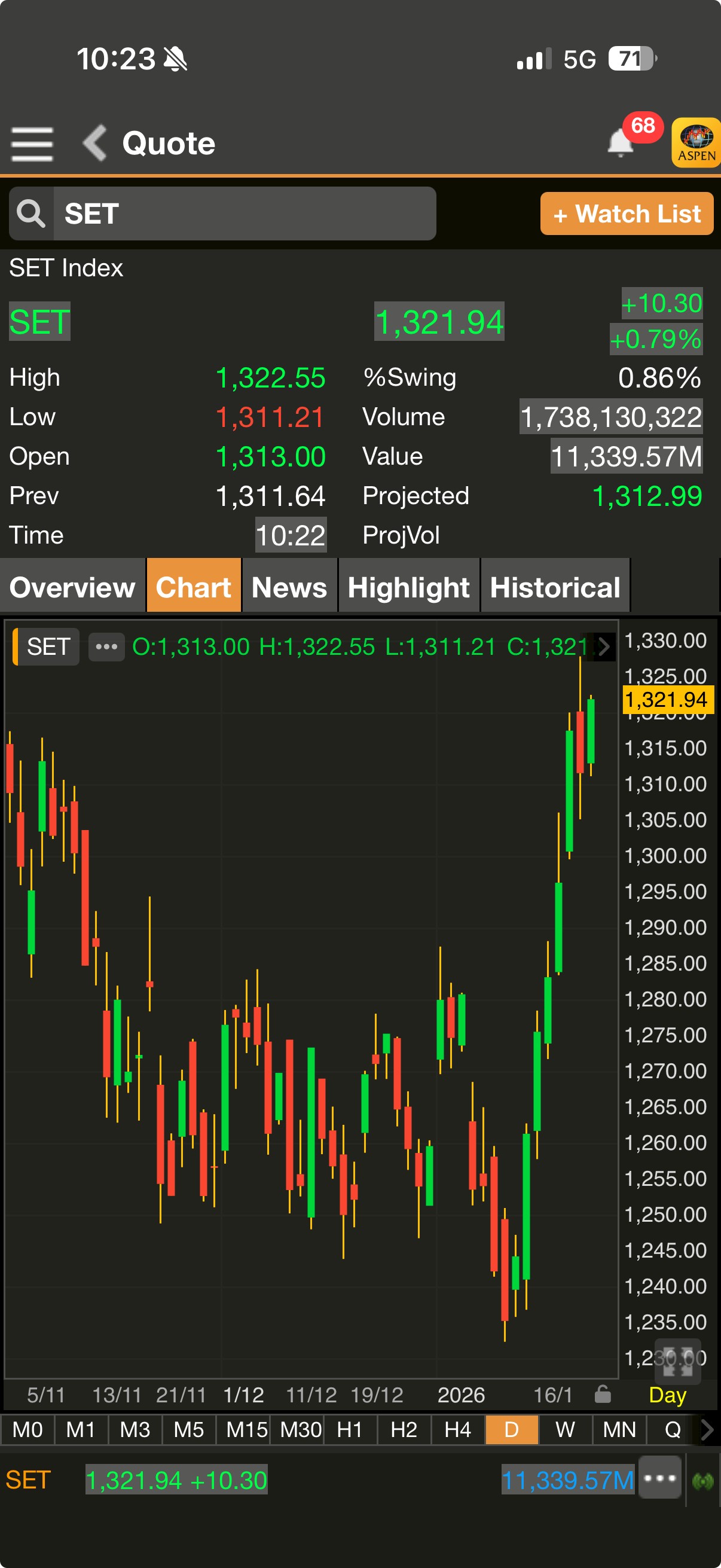 เมื่อเวลา 10.22 น. ดัชนี SET มาอยู่ที่ 1,321.94 จุด เพิ่มขึ้น 10.30 จุด (+0.95%)