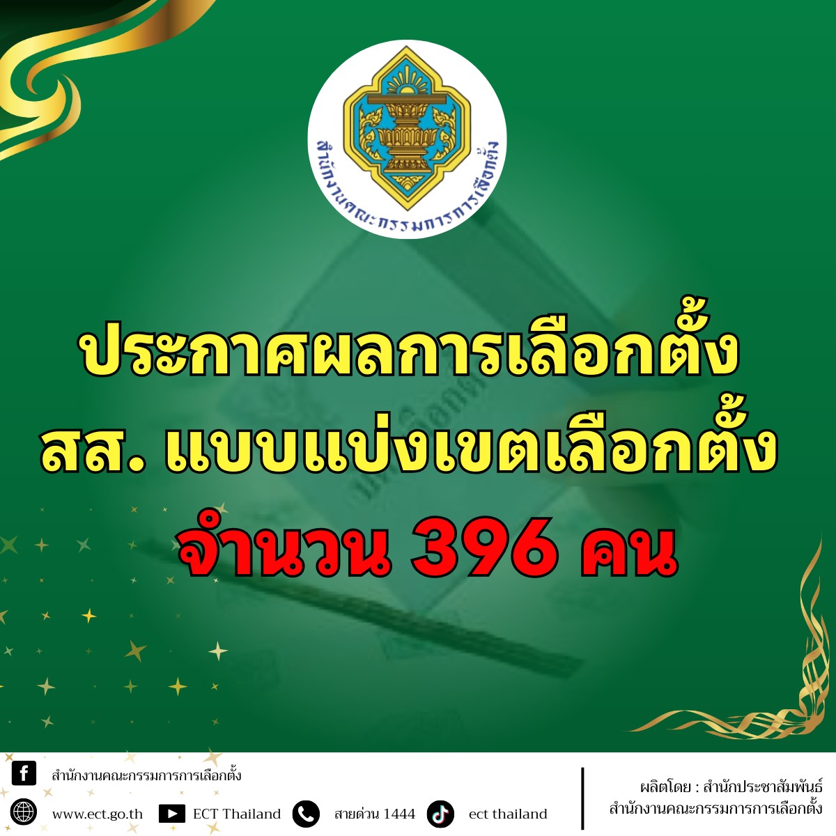 สำนักงานคณะกรรมการเลือกตั้ง (กกต.) มีมติประกาศรับรองผลการเลือกตั้ง สส.แบบแบ่งเขตเลือกตั้ง ทั้ง 396 เขตเลือกตั้งตามที่สำนักงาน กกต.เสนอ หลังได้รับรายงานผลการตรวจสอบ และรับฟังรายงานจากผู้ตรวจการเลือกตั้งแล้วว่าการเลือกตั้งเป็นไปโดยสุจริตเที่ยงธรรม