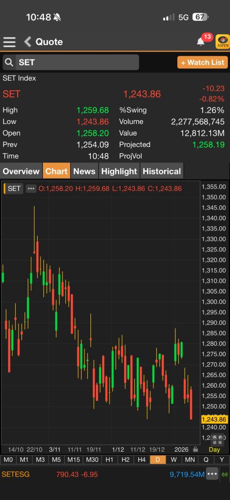 หุ้นไทยปิดเช้าลบ 5.77 จุด รับแรงขายหุ้น รพ.ใหญ่ กลุ่มค้าปลีก-ท่องเที่ยวกดดันซ้ำ