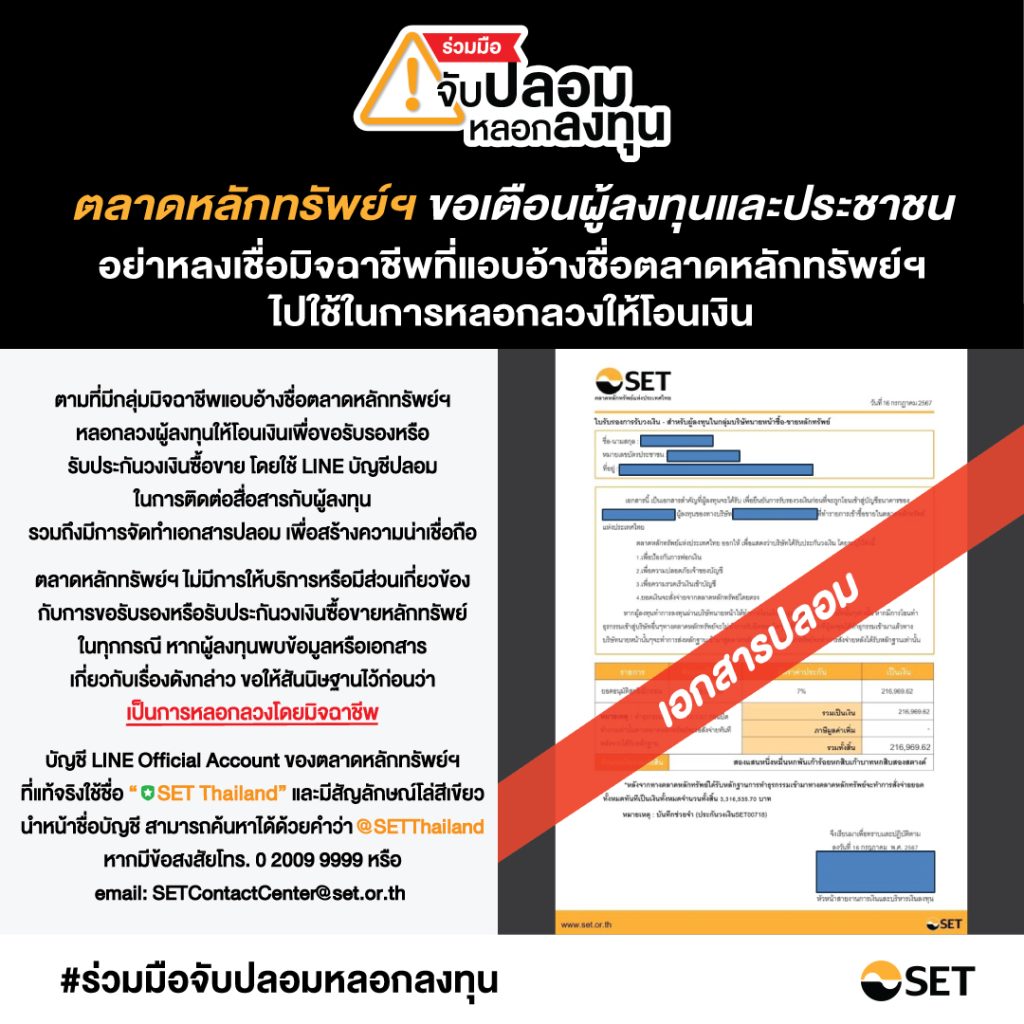 ตลท.ย้ำเตือนอย่าหลงเชื่อมิจฉาชีพแอบอ้างชื่อหลอกลวงให้โอนเงินผ่านไลน์