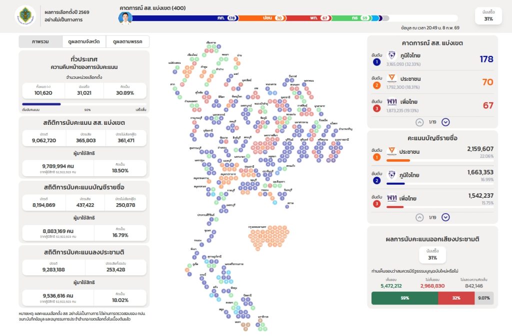 เลือกตั้ง’69: ผลนับคะแนนล่าสุด ภท.นำขาด 196 ที่นั่ง ประชามติส่วนใหญ่เห็นชอบทำ รธน.ใหม่