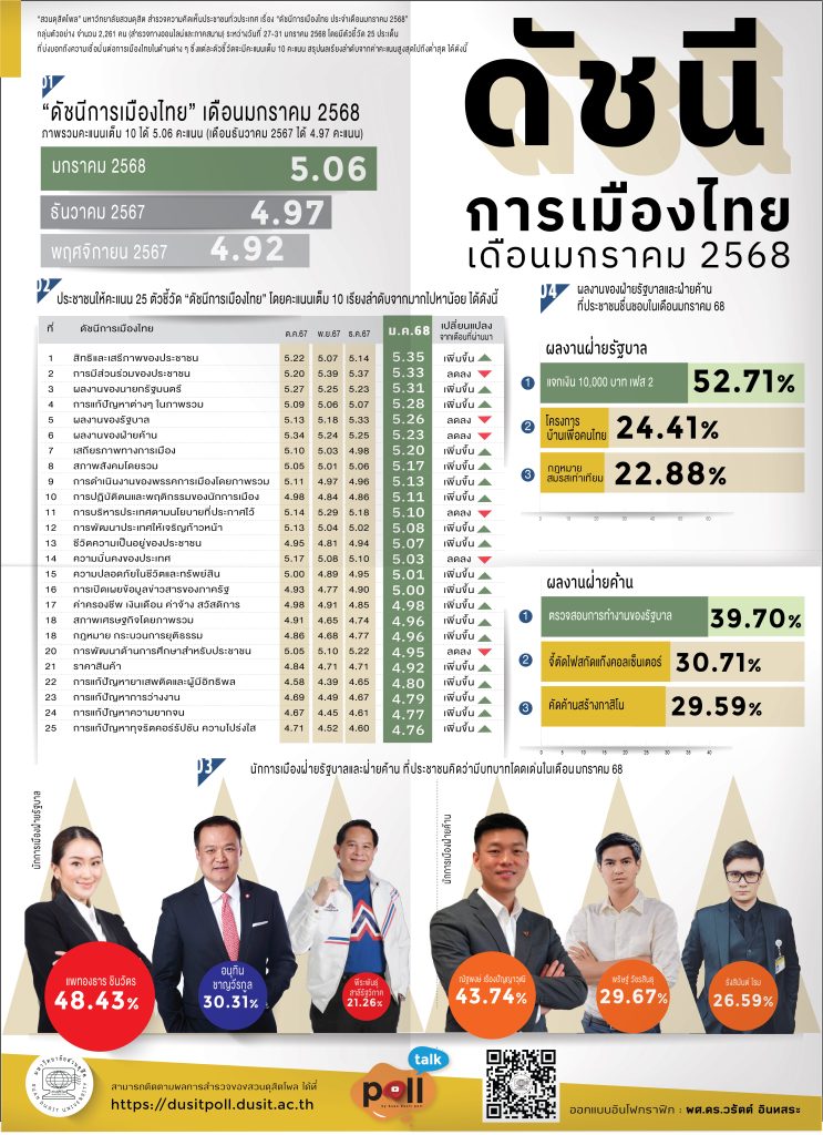 โพลดัชนีการเมือง ม.ค. 68 เพิ่มขึ้น “อิ๊งค์-เท้ง”โดดเด่น ปัญหาทุจริตคอร์รัปชันตกต่ำ
