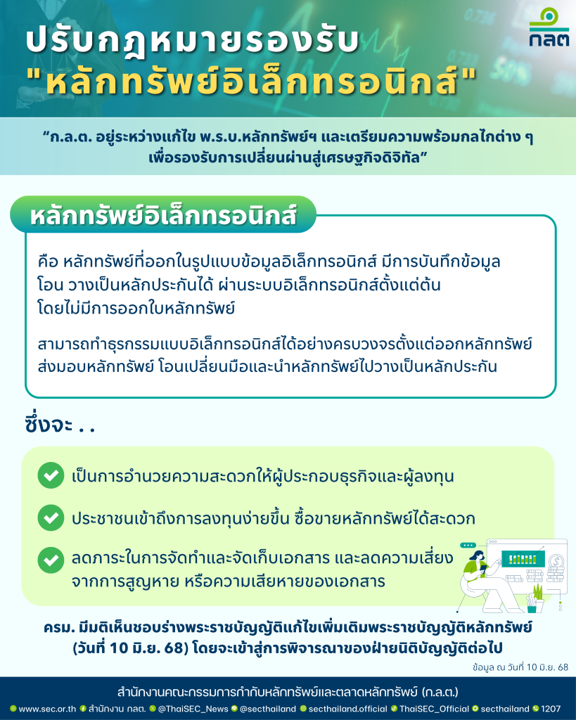 ก.ล.ต. เตรียมพร้อมจัดทำหลักเกณฑ์รองรับหลักทรัพย์อิเล็กทรอนิกส์หลัง ครม.เคาะร่างกฎหมาย