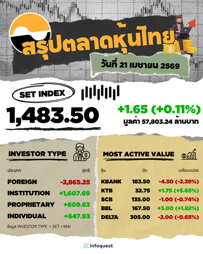 หุ้นไทยบวก 4.48 จุด ได้ DELTA ค้ำดัชนีบวกสวนตลาดเอเชีย จับตาเจรจาสันติภาพสหรัฐฯ-อิหร่าน