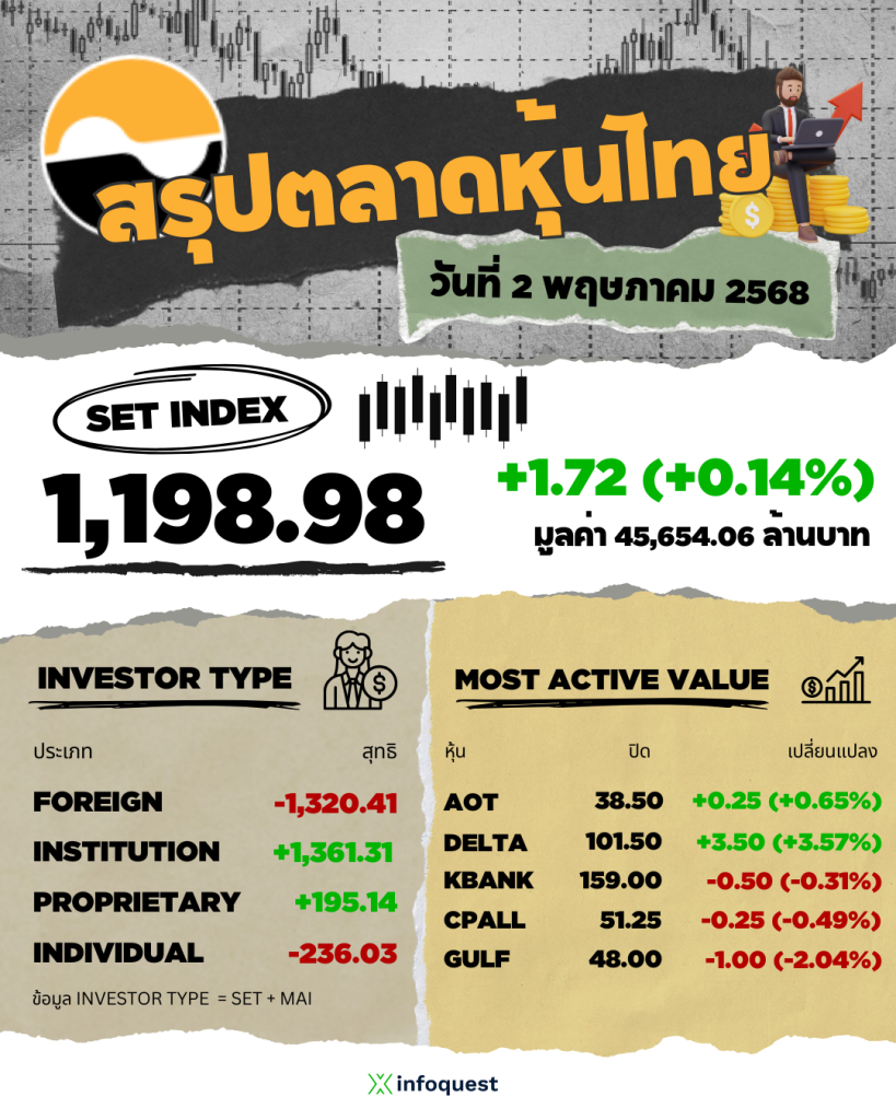 ดัชนี SET ภาคบ่ายบวกกว่า 10 จุด รับแรงซื้อ AOT นำกลุ่มท่องเที่ยว-บาทแข็งหนุน Flow ไหลเข้า