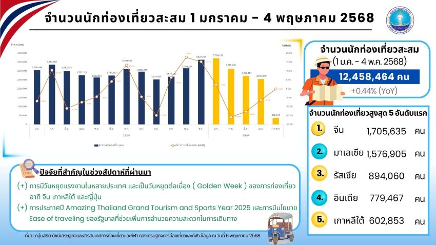 ต่างชาติเที่ยวไทยทะลุ 27.5 ล้านคน โกยรายได้แล้ว 1.2 ล้านลบ. มาเลย์ยังแชมป์