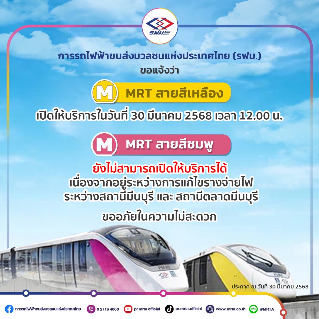 เตรียมเปิดบริการรถไฟฟ้าสายสีเหลืองเที่ยงวันนี้ สายสีชมพูยังปิดอีก 1 วัน ย้ำสายสีม่วงแข็งแรงดี