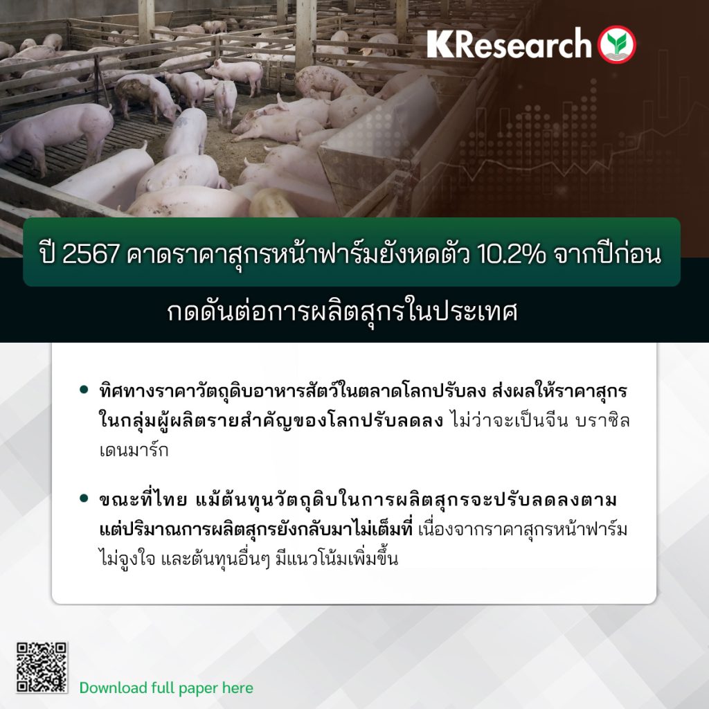 วิจัยกสิกรฯ คาดปี 67 ราคาสุกรหน้าฟาร์มหดตัว 10.2% กดดันการผลิตในประเทศ