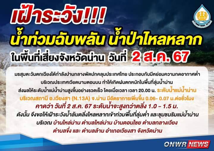 สทนช. เตือน 24 จ. เสี่ยงน้ำท่วมฉับพลัน-น้ำป่าไหลหลาก-ดินโคลนถล่ม ช่วง 15-17 ส.ค.
