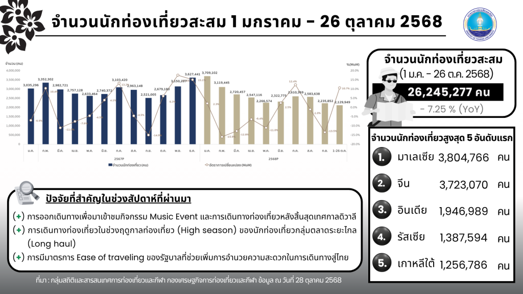 ต่างชาติเที่ยวไทยยังชะลอ!! เปิดตัวเลขสัปดาห์ล่าสุด -5.11%