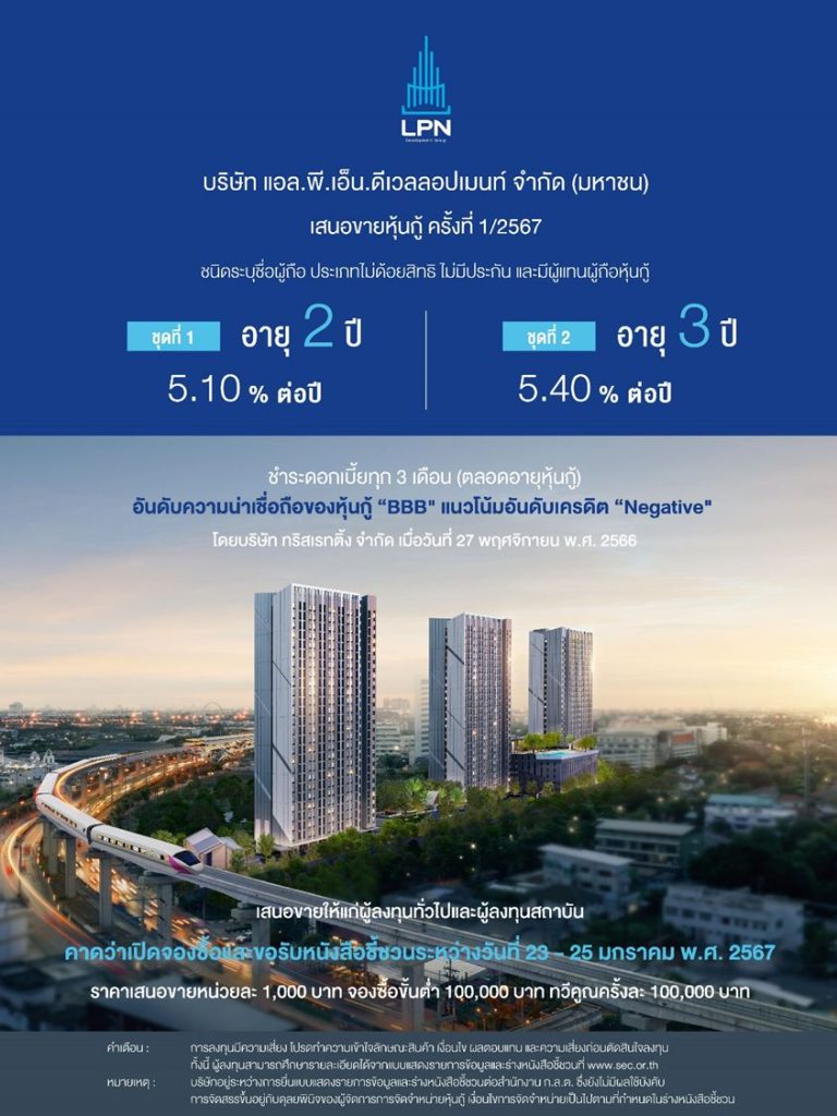 LPN ออกหุ้นกู้ 2 ชุด ชูดอกเบี้ย 5.10-5.40% เปิดขาย 23-25 ม.ค.